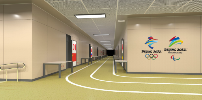 此外,冬殘奧會(huì)時(shí),在運(yùn)動(dòng)員更衣室至比賽場(chǎng)地,全部鋪上仿真冰板,運(yùn)動(dòng)員可以從更衣室滑行進(jìn)入比賽場(chǎng)地,解決了運(yùn)動(dòng)員需要進(jìn)入賽場(chǎng)后更換冰橇的不便。運(yùn)動(dòng)員流線涉及到的區(qū)域都鋪設(shè)了地膠墊,地膠墊的銜接處都進(jìn)行了“對(duì)齊”處理。這樣不僅保護(hù)了冰球運(yùn)動(dòng)員,防止硬地面損傷冰刀;也保護(hù)了殘奧運(yùn)動(dòng)員,起到防滑、減震的效果,預(yù)防殘奧運(yùn)動(dòng)員摔倒受傷。比賽時(shí),國(guó)家體育館將最佳觀賽座席留給殘障人群,盡顯人文關(guān)懷。