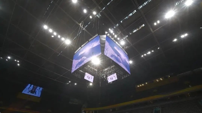 為了提升場(chǎng)館內(nèi)觀眾感官效果,除了對(duì)原主場(chǎng)館南北兩側(cè)的顯示屏進(jìn)行更新外,還在場(chǎng)館中央增加了曲面斗屏,外形就像漏斗一樣。斗屏采用了上寬下窄、外凸式曲面設(shè)計(jì),將視角寬度每邊擴(kuò)大6°,每面屏視角172°,增強(qiáng)美觀性的同時(shí),也滿足了場(chǎng)地內(nèi)觀眾近乎全角度的觀感。在清晰度方面,由于縮小了屏幕點(diǎn)間距,可達(dá)到1080P觀看效果。