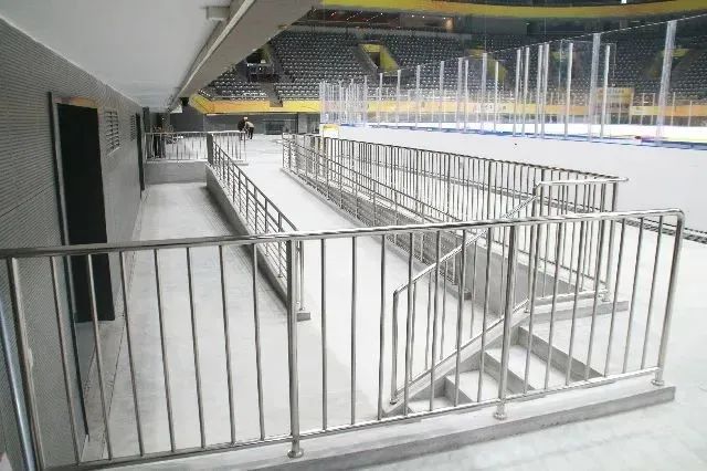 “冰之帆”的無(wú)障礙設(shè)施在此前基礎(chǔ)上已有整體提升。場(chǎng)館里的所有客梯均進(jìn)行了無(wú)障礙改造,場(chǎng)館內(nèi)沒(méi)有一處門(mén)檻,殘障人士可從各個(gè)入口直達(dá)比賽場(chǎng)地及無(wú)障礙看臺(tái);館內(nèi)此次還增加了36個(gè)無(wú)障礙看臺(tái),因地制宜將看臺(tái)突出,做成類(lèi)似陽(yáng)臺(tái)的樣子,分散在各個(gè)場(chǎng)館的入口處,可讓殘障觀眾距離冰球比賽場(chǎng)地更近,極大地提升觀賽體驗(yàn)。運(yùn)動(dòng)員落客區(qū)及賽時(shí)更衣室進(jìn)入主館的道路上,有兩條1:12的坡度比例無(wú)障礙坡道,在坡道一側(cè)墻體加裝了扶手,這是考慮到殘奧冰球運(yùn)動(dòng)員普遍為下肢不便,需要用到扶手來(lái)進(jìn)行借力。