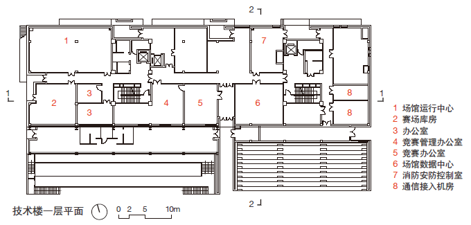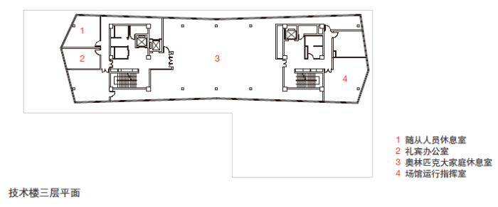 場(chǎng)館技術(shù)樓是最重要的永久建筑之一,從運(yùn)動(dòng)員舉槍瞄準(zhǔn)這一動(dòng)作中產(chǎn)生設(shè)計(jì)靈感,以一條連貫的折線串聯(lián)建筑屋頂與看臺(tái),形成極具張力的造型。場(chǎng)館技術(shù)樓建筑面積為4890平方米,共有地下一層、地上四層,地下一層為興奮劑監(jiān)測(cè)站,首層主要滿足競(jìng)賽管理功能,二層為平臺(tái),三層為奧林匹克大家庭,四層為仲裁、計(jì)分及計(jì)時(shí)等比賽技術(shù)用房。