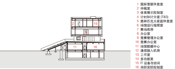 國(guó)家越野滑雪中心的臨時(shí)設(shè)施要比國(guó)家跳臺(tái)滑雪中心和國(guó)家冬季兩項(xiàng)中心都要多,有13000平方米的臨時(shí)設(shè)施,觀眾席座椅后面搭建的三層房屋為臨時(shí)設(shè)施,上面兩層為OBS評(píng)論席,有41間,房子最上面有欄桿的地方是攝像機(jī)位,還有解說席?;旌喜稍L區(qū)是臨時(shí)設(shè)施,下面一層半為電視轉(zhuǎn)播;上面一層半為文字記者。運(yùn)動(dòng)員更衣室是臨時(shí)的。看臺(tái)也是臨時(shí)的,是用腳手架搭起來的。打造許多臨時(shí)建筑是與綠色辦奧、共享辦奧、開放辦奧、廉潔辦奧的理念相契合的。建設(shè)之初,國(guó)家越野滑雪中心就充分考慮了賽時(shí)需求與賽后利用,許多臨建場(chǎng)館合理設(shè)置于場(chǎng)地綜合區(qū)內(nèi)。設(shè)計(jì)施工時(shí)將功能用房用輕質(zhì)隔墻分隔,便于賽后拆除,也可根據(jù)規(guī)劃重新設(shè)計(jì)分隔。部分看臺(tái)及比賽配套設(shè)施采用臨時(shí)建筑,賽后也可進(jìn)行拆除及回收利用,讓冬奧場(chǎng)館實(shí)現(xiàn)全生命周期的綠色、低碳。
