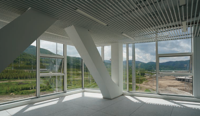 國(guó)家越野滑雪中心使用傳統(tǒng)建筑施工為自下而上逐層施工,采用鋼框架—中心支撐結(jié)構(gòu)體系,完成地下一層、首層及中心支撐施工后,首先進(jìn)行四層框架梁施工,隨后施工桁架層及吊柱,最后施工懸掛的三層樓面梁。技術(shù)樓是整個(gè)中心的關(guān)鍵工程,外墻裝飾采用了20毫米厚的玻璃纖維增強(qiáng)混凝土(俗稱GRC板),可實(shí)現(xiàn)大面積板材預(yù)制,每塊板材都是獨(dú)立設(shè)計(jì),工廠定制加工,現(xiàn)場(chǎng)直接安裝,有效避免了建材損耗、現(xiàn)場(chǎng)污染。它的中空玻璃幕墻既便于裁判、技術(shù)官員觀察賽場(chǎng),又能更好滿足場(chǎng)館對(duì)于抗風(fēng)壓性、水密性、氣密性的嚴(yán)格要求,減少室內(nèi)冷氣或熱量散失的同時(shí),還能降低空調(diào)負(fù)荷、減少能耗。