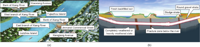 長沙湘江營盤路隧道主線為雙向四車道,主線西起咸嘉湖路,東接營盤路,全長2850 m,設(shè)計(jì)時(shí)速為50 km。西岸設(shè)A、B匝道,東岸設(shè)C、D匝道,匝道為單車道,設(shè)計(jì)時(shí)速為40 km,總長2752.4 m,采用鉆爆法施工,其平面布置見圖7。營盤路隧道穿越的地層主要有圓礫層、全強(qiáng)風(fēng)化板巖、回填新土,地層透水性強(qiáng)、自穩(wěn)能力差,開挖易坍塌涌水。在江底分別穿越3條斷層破碎帶。見圖7。