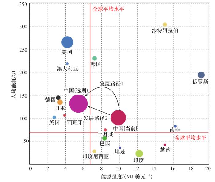 圖 1 2020 年部分國(guó)家能源消費(fèi)現(xiàn)狀及我國(guó)節(jié)能措施下能源發(fā)展路徑
