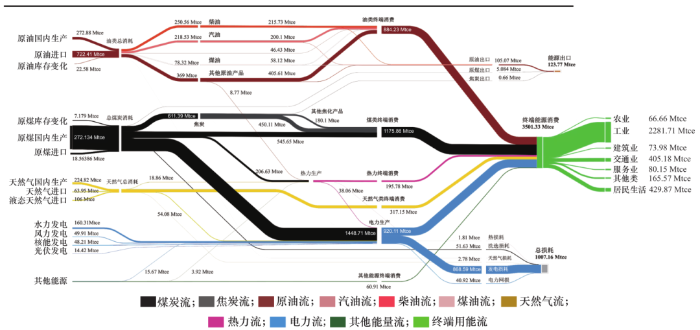 評(píng)估節(jié)能潛力、實(shí)施節(jié)能舉措,需要結(jié)合當(dāng)前我國(guó)能源消費(fèi)構(gòu)成和特點(diǎn)來開展。根據(jù)2019年能源消費(fèi)數(shù)據(jù),采用電熱當(dāng)量法繪制了我國(guó)能源消費(fèi)?;鶊D(見圖2),以直觀清晰地描述各類能源轉(zhuǎn)換和消費(fèi)的路徑及數(shù)量。