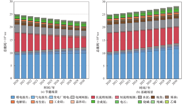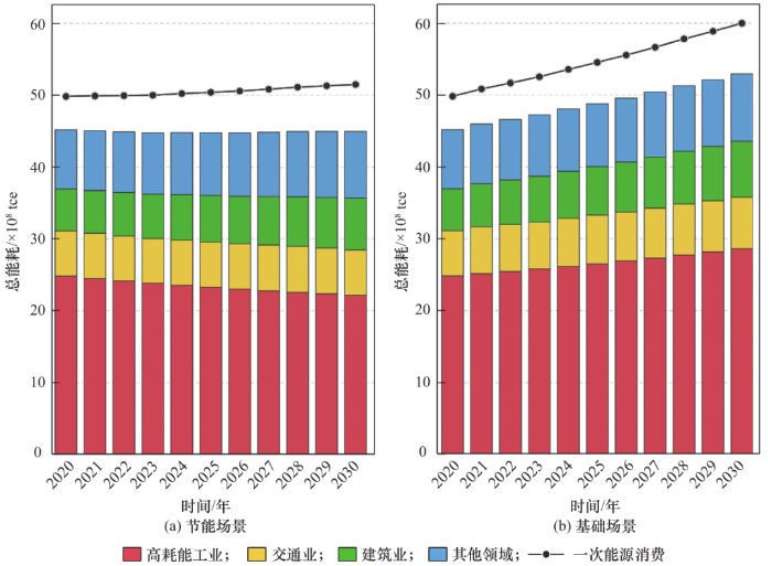 綜上,我國(guó)高耗能工業(yè)領(lǐng)域在2030年可實(shí)現(xiàn)節(jié)能約6×108 tce,相當(dāng)于2019年該領(lǐng)域能源消費(fèi)總量的24.5%;2021—2030年累計(jì)節(jié)能約3.37×109 tce,節(jié)能潛力貢獻(xiàn)主要來自于鋼鐵和電力部門。在基礎(chǔ)場(chǎng)景下工業(yè)領(lǐng)域總能源消費(fèi)呈持續(xù)上升趨勢(shì),而采取節(jié)能措施后可實(shí)現(xiàn)總體能源消費(fèi)的逐步下降。
