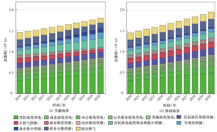 綜上,我國(guó)建筑領(lǐng)域在2030年可實(shí)現(xiàn)節(jié)能約8.05×107 tce,相當(dāng)于2019年建筑能源消費(fèi)總量的14.7%;2021—2030年的累計(jì)節(jié)能約為5.3×108 tce,將顯著降低碳排放量的上升速度,主要貢獻(xiàn)來自清潔供暖和節(jié)約用電。兩種場(chǎng)景下的建筑領(lǐng)域的能源消費(fèi)量均呈持續(xù)上升趨勢(shì),但節(jié)能場(chǎng)景下的能源消費(fèi)量上升速度明顯低于基礎(chǔ)場(chǎng)景(見圖 6)。