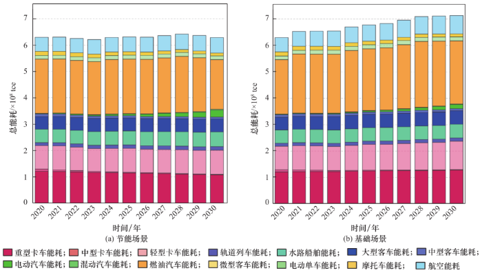 交通領(lǐng)域節(jié)能潛力分析模型主要涉及客運(yùn)和貨運(yùn)兩大類,其中公路交通因能源消費(fèi)占比較高是重點(diǎn)節(jié)能部門。預(yù)計(jì)到2030年,在節(jié)能場(chǎng)景下我國(guó)公路客運(yùn)節(jié)能潛力約為4.35×107 tce,主要來自于新能源汽車對(duì)燃油汽車的替代;通過綜合運(yùn)用“公轉(zhuǎn)鐵”“公轉(zhuǎn)水”、多式聯(lián)運(yùn)、發(fā)動(dòng)機(jī)能效水平提升等手段,公路貨運(yùn)的節(jié)能潛力約為3.7×107 tce,水路和鐵路貨運(yùn)交通能耗則上升至7.8×106 tce,航空運(yùn)輸通過提升發(fā)動(dòng)機(jī)能效可實(shí)現(xiàn)節(jié)能約1×107 tce。