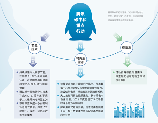 在《報(bào)告》中騰訊提出“不晚于2030年,實(shí)現(xiàn)自身運(yùn)營(yíng)及供應(yīng)鏈的全面碳中和。同時(shí),不晚于2030年,實(shí)現(xiàn)100%綠色電力”的目標(biāo),同時(shí)在做好自身碳中和之外,通過助力產(chǎn)業(yè)、引導(dǎo)消費(fèi)者、推動(dòng)技術(shù)發(fā)展等方式不斷助力國(guó)家“雙碳”目標(biāo)的實(shí)現(xiàn)。
