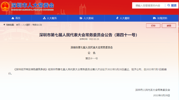 《深圳經(jīng)濟特區(qū)綠色建筑條例》經(jīng)深圳市第七屆人民代表大會常務委員會第八次會議于2022年3月28日通過,現(xiàn)予公布,自2022年7月1日起施行。