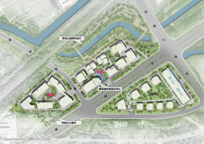 項(xiàng)目分為A、B兩個(gè)地塊,由一條景觀主軸、一條產(chǎn)業(yè)配套帶交叉串聯(lián)?;趫@區(qū)的生態(tài)基底,空間組團(tuán)與外部濱水景觀可以互相滲透,并連接產(chǎn)業(yè)中心、展示中心和活力中心3個(gè)主題式庭院,拓展出更多流動(dòng)場景體驗(yàn)。