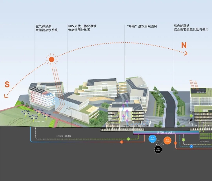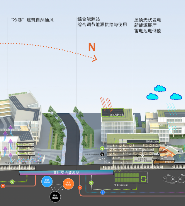 生態(tài)區(qū)作為南京碳中和建筑集聚式、高品質(zhì)示范區(qū),規(guī)劃上結(jié)合了它“新能源”與“可持續(xù)”的特征,從“可再生能源分布式應(yīng)用、高品質(zhì)園區(qū)規(guī)?;季帧⒐┙o側(cè)能源共享化服務(wù)、近零碳建筑集聚式示范、需求側(cè)終端電氣化貫徹”5個(gè)策略出發(fā),應(yīng)用光伏幕墻、地源熱泵、冰蓄冷等可持續(xù)技術(shù),構(gòu)建園區(qū)共用綜合能源站。