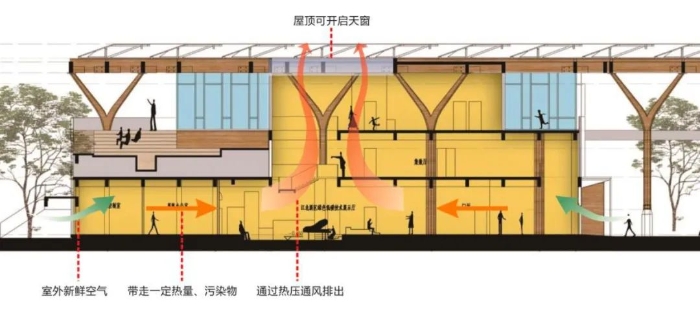 樓內(nèi)設(shè)置的新能源體驗(yàn)展示中心,結(jié)合休閑服務(wù)引導(dǎo)使用者參與互動(dòng)式參觀動(dòng)線,以科教一體的小型立體花園式展示中心的形象呈現(xiàn)。中庭空間是整棟建筑的生態(tài)氣候核,過渡季打開頂部天窗,起到熱壓拔風(fēng)效果,冬季則將更多太陽輻射引入室內(nèi),減少空調(diào)開啟。