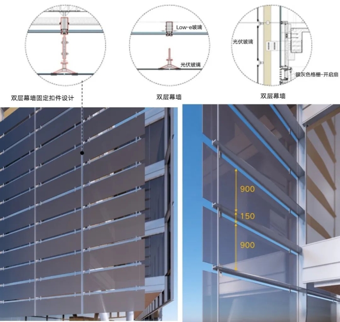 在光伏幕墻的選擇上,為了控制不同立面的呈現(xiàn)效果并作為施工圖依據(jù),我們推敲和選擇了5種幕墻系統(tǒng)。街角示范樓作為沿街展示面,采用雙層幕墻固定扣件設(shè)計(jì)銜接兩種相異的玻璃材質(zhì);園區(qū)內(nèi)部的幕墻設(shè)計(jì)更加強(qiáng)調(diào)橫向線條給人的視覺感染力,采用金屬格柵和鋁板的結(jié)合;B地塊的幕墻主體也沿用這種設(shè)計(jì),但在三種材料的拼合方式上會(huì)更加注重輕快和簡潔的感受。