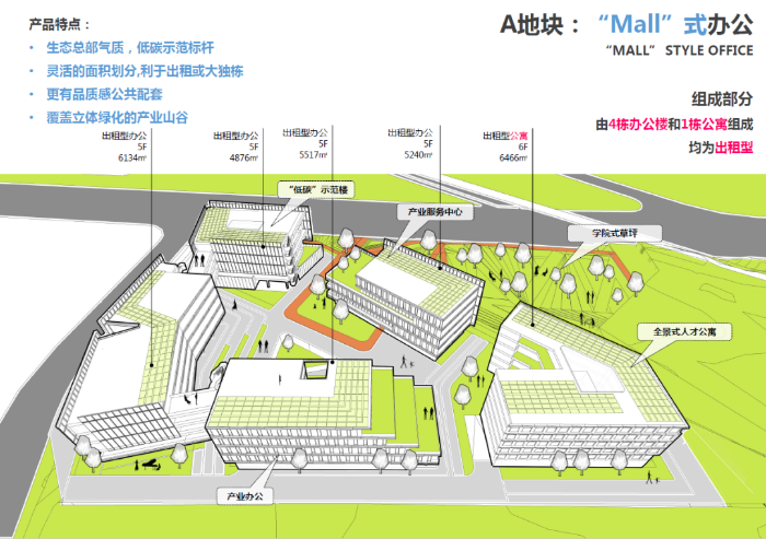 MALL式園區(qū)空間,由4棟辦公樓和1棟公寓組成,產(chǎn)業(yè)辦公樓、綠色建筑示范樓、產(chǎn)業(yè)服務(wù)中心和全景式人才公寓均設(shè)置在此地塊。考慮到企業(yè)和員工使用時(shí)的集約性和便利性,區(qū)域面積講究靈活劃分,搭配具備品質(zhì)感的公共配套,利于出租或大獨(dú)棟處理;點(diǎn)綴在各個(gè)組團(tuán)的服務(wù)功能,輔以覆蓋立體綠化的產(chǎn)業(yè)山谷和學(xué)院式草坪,更加彰顯生態(tài)總部氣質(zhì)。