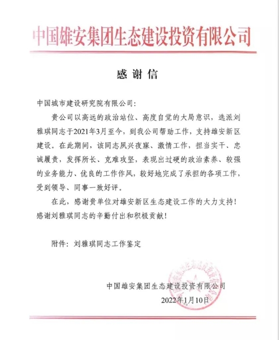 如今借調(diào)期滿,很榮幸收到了生態(tài)公司的感謝信,這既是對我工作的肯定,也是對我的鼓勵和鞭策,讓我在之后的工作中繼續(xù)帶著新區(qū)擔(dān)當(dāng)實干,攻堅克難的這股拼勁勇敢向前沖!