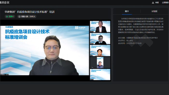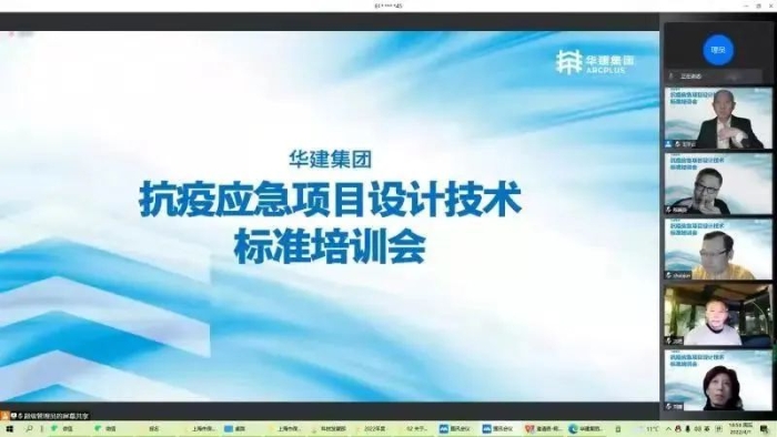 2022年4月1日晚上,華建集團(tuán)召開企業(yè)標(biāo)準(zhǔn)《華建集團(tuán)抗疫應(yīng)急項(xiàng)目設(shè)計(jì)技術(shù)標(biāo)準(zhǔn)》發(fā)布暨培訓(xùn)會(huì)議。華建集團(tuán)黨委副書記、總裁沈立東,黨委副書記、工會(huì)主席夏冰,集團(tuán)總工程師王衛(wèi)東和集團(tuán)總建筑師沈迪出席會(huì)議,上海市住建委標(biāo)定處處長(zhǎng)陳雷也應(yīng)邀出席。會(huì)議采用在線直播的方式進(jìn)行,由集團(tuán)常務(wù)副總工程師王平山主持,集團(tuán)內(nèi)外總共3000多人參加了會(huì)議。