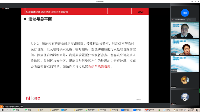 在培訓(xùn)環(huán)節(jié),集團(tuán)上海院總建筑師陳國(guó)亮簡(jiǎn)要介紹了本標(biāo)準(zhǔn)“安全性為首要原則,功能性為基本原則,舒適性和便捷性為次要原則”的總體原則,并和全國(guó)工程勘察設(shè)計(jì)大師李亞明,趙俊、朱學(xué)錦、陳眾勵(lì)等專家一起,對(duì)標(biāo)準(zhǔn)的“上海市臨時(shí)集中隔離收治點(diǎn)設(shè)施設(shè)計(jì)”部分內(nèi)容進(jìn)行詳細(xì)講解,集團(tuán)華東院曹賢林、花炳燦、陳新宇、劉蕾、王宇等專家對(duì)標(biāo)準(zhǔn)的“租賃房項(xiàng)目用于臨時(shí)觀察場(chǎng)所適應(yīng)性改造技術(shù)”進(jìn)行講解。