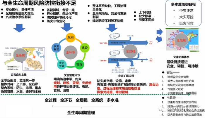 第三,與全生命周期風(fēng)險(xiǎn)防控銜接不足。目前防災(zāi)工作仍存在整體系統(tǒng)缺位,工程治理全責(zé)化,全局觀落后,安全與發(fā)展割裂,規(guī)劃防災(zāi)不對等不協(xié)調(diào)等問題。在管理過程中,應(yīng)首先設(shè)置中災(zāi)正常、大災(zāi)可控、巨災(zāi)可救的多水準(zhǔn)防御目標(biāo)。明確防治水平,約束規(guī)劃、建設(shè)、管理、災(zāi)后使用各環(huán)節(jié)協(xié)調(diào)評估、布局、管制和治理。形成全過程、全環(huán)節(jié)、全層級、全系統(tǒng)、多水準(zhǔn)的全生命周期管理體系,共同促進(jìn)城市的安全、韌性、可持續(xù)發(fā)展。