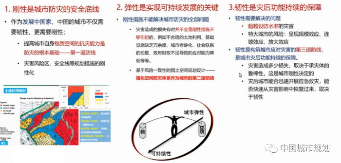 第二,通過剛性、彈性、韌性相配合解決防災(zāi)安全問題。剛性是城市防災(zāi)的安全底線,彈性是實(shí)現(xiàn)可持續(xù)發(fā)展的關(guān)鍵,韌性是災(zāi)后功能持續(xù)的保障。馬教授指出,作為發(fā)展中國家,中國的城市不僅需要韌性,更需要?jiǎng)傂裕枰?guī)劃防災(zāi)措施的剛性化,提高城市自身物質(zhì)空間的抗災(zāi)能力是防災(zāi)的根本基礎(chǔ)和第一道防線,構(gòu)建基于風(fēng)險(xiǎn)一致性的國土空間規(guī)劃設(shè)計(jì),將空間防災(zāi)體系作為城市的第二道防線,韌性是構(gòu)筑城市應(yīng)對災(zāi)害的第三道防線,是城市災(zāi)后功能持續(xù)的保障。