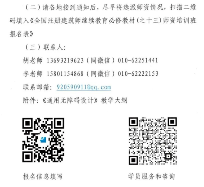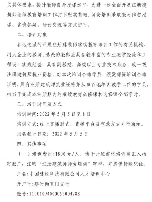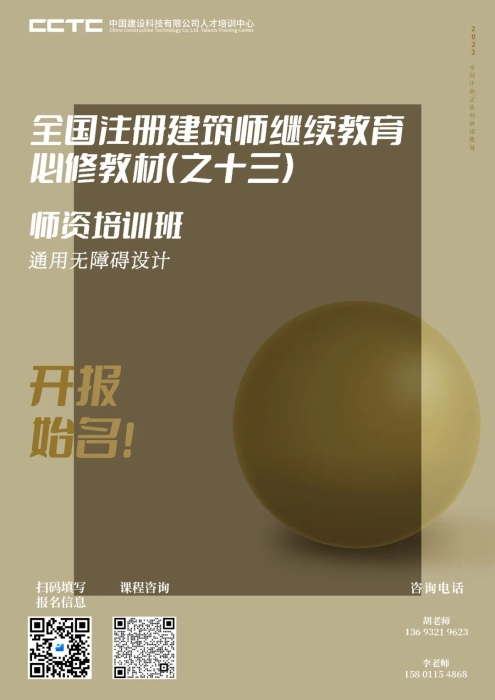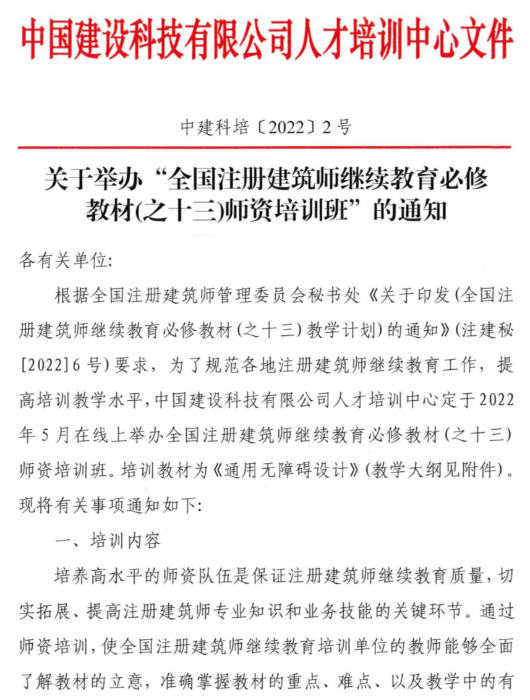 根據(jù)全國注冊建筑師管理委員會秘書處《關(guān)于印發(fā) (全國注冊建筑師繼續(xù)教育必修教材 (之十三)教學(xué)計劃)的通知》(注建秘[2022]6號)要求,為了規(guī)范各地注冊建筑師繼續(xù)教育工作,提高培訓(xùn)教學(xué)水平,中國建設(shè)科技有限公司人才培訓(xùn)中心定于2022年5月在線上舉辦全國注冊建筑師繼續(xù)教育必修教材(之十三)師資培訓(xùn)班。培訓(xùn)教材為《通用無障礙設(shè)計》(教學(xué)大綱見下文)。