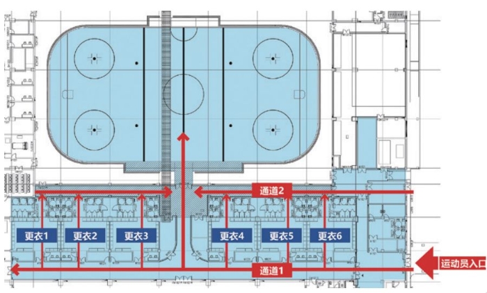 由于冰壺比賽冰面清潔要求較高,經(jīng)過對國家冰壺隊的調(diào)研發(fā)現(xiàn),存在生活輪椅與比賽輪椅混用的情況,在進入冰面之前,需要花費很多時間對輪椅進行細致的清潔,效率過低。因此,在運動員入口處加設(shè)一個輪椅換乘廳,方便運動員將生活輪椅直接換成比賽輪椅,免除反復清潔的環(huán)節(jié),提高比賽訓練效率。