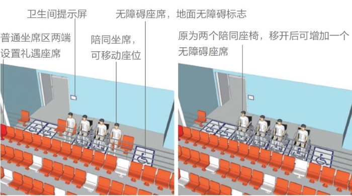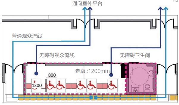 冰球館承載比賽功能,在冰球館二層四周設(shè)置200個無障礙坐席,將比賽球場圍繞在中心,分12個區(qū),每個區(qū)域配有獨立出入口和無障礙衛(wèi)生間,不與普通觀眾共用出入口,保證殘疾人觀眾的疏散安全,避免與普通觀眾造成流線交叉,相互干擾(圖14)。