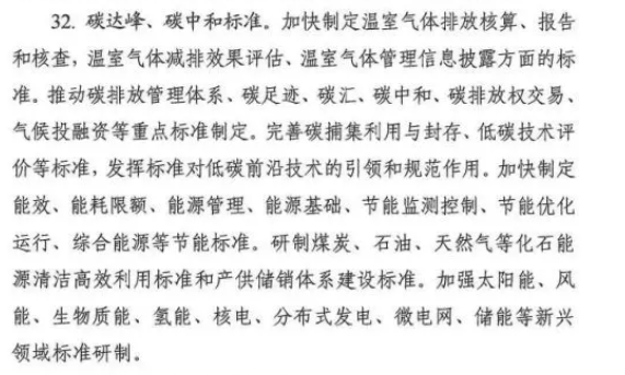 此前國(guó)家標(biāo)準(zhǔn)化管理委員會(huì)、中央網(wǎng)信辦、科技部、工業(yè)和信息化部、民政部 、生態(tài)環(huán)境部 、住房和城鄉(xiāng)建設(shè)部 、農(nóng)業(yè)農(nóng)村部、 商務(wù)部 、應(yīng)急部關(guān)于印發(fā)《“十四五”推動(dòng)高質(zhì)量發(fā)展的國(guó)家標(biāo)準(zhǔn)體系建設(shè)規(guī)劃》的通知,通知指出十四五期間要圍繞碳達(dá)峰、碳中和技術(shù)出臺(tái)系列國(guó)家標(biāo)準(zhǔn),涉及很多碳中和技術(shù)。