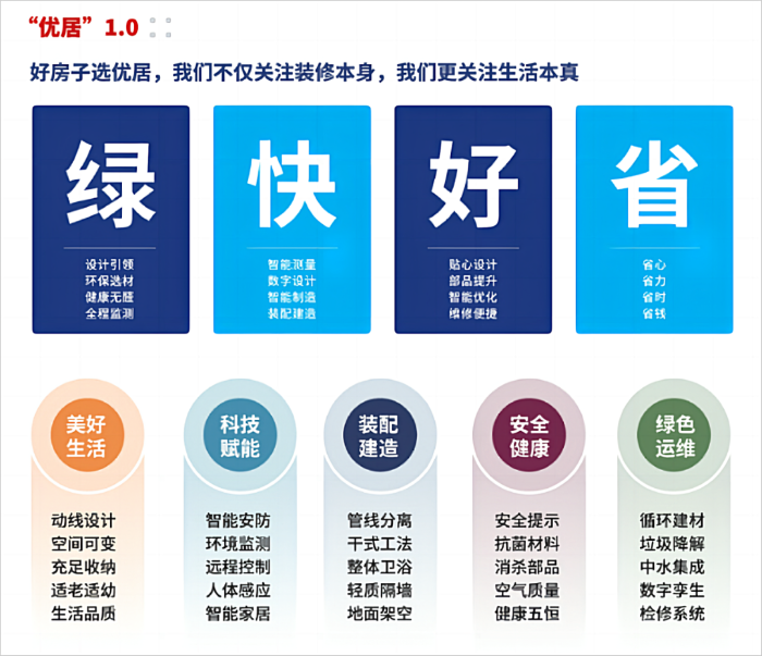國(guó)標(biāo)公司提出優(yōu)居1.0概念,構(gòu)建了涵蓋生活方式、主材產(chǎn)品開(kāi)發(fā)、木作產(chǎn)品開(kāi)發(fā)、數(shù)字化整裝產(chǎn)品銷(xiāo)售體驗(yàn)、數(shù)字化跟蹤服務(wù)體驗(yàn)、數(shù)字化產(chǎn)品運(yùn)營(yíng)體驗(yàn)的整裝產(chǎn)品六大體系,助力打造兼具美好生活、科技賦能、裝配建造、安全健康、綠色運(yùn)維的好房子。