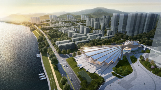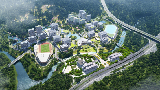 由華森公司規(guī)劃設(shè)計(jì)的深圳職業(yè)技術(shù)大學(xué)深汕校區(qū)選址于深汕特別合作區(qū)赤石鎮(zhèn),四面環(huán)山,赤石河和碗窯洞河在此交匯,山水資源豐富。該項(xiàng)目以“傍水依山、潤(rùn)玉環(huán)珠”為理念,將山水環(huán)境、地貌特征、組團(tuán)結(jié)構(gòu)、形態(tài)特征、教學(xué)模式等要點(diǎn)融入方案設(shè)計(jì),探索人、校園、自然之間和諧共生的關(guān)系。