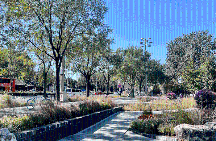 中央綠化隔離帶的設(shè)立改變了整條街道的尺度,重構(gòu)了街景空間。平安大街雙向6車道,局部7車道,再加上非機(jī)動(dòng)車道,近30米寬的距離是舊城肌理中的一道巨大裂痕。中央綠化帶的增設(shè),使其與兩側(cè)行道樹之間距離變?yōu)?0多米,重新形成與老城核心區(qū)相適宜的街道尺度和林蔭道空間,同時(shí),街道綠視率也由原來的15%增加到25%以上,極大改善了車行和人行空間的視覺感受。