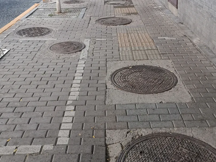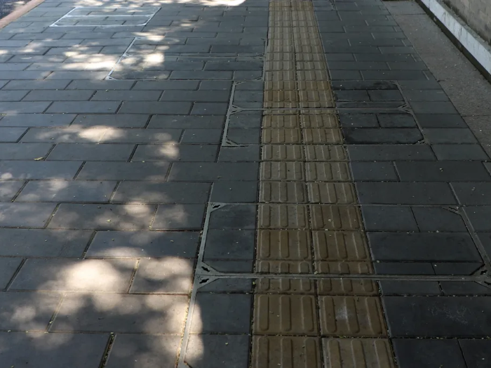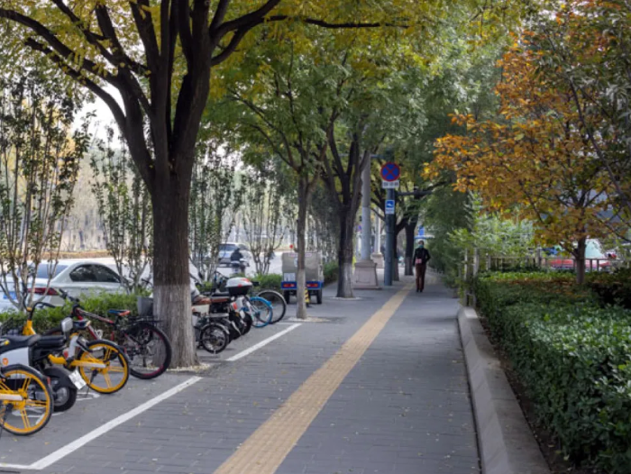 ▲采用大規(guī)格灰色透水磚,井蓋隱形化,設(shè)置連續(xù)的盲道行進(jìn)系統(tǒng)