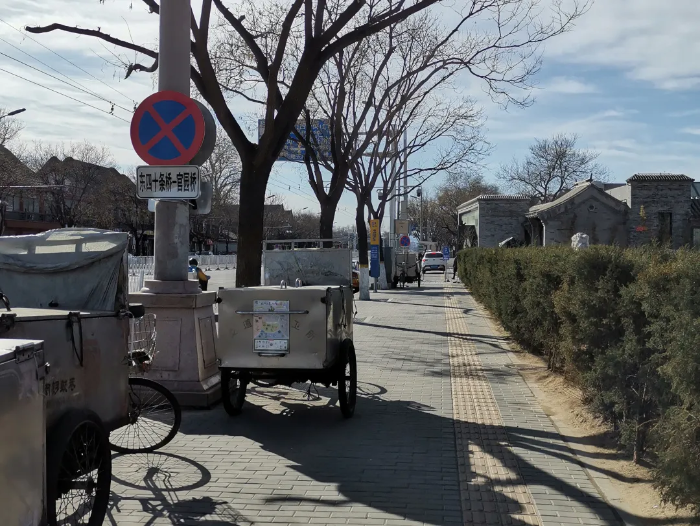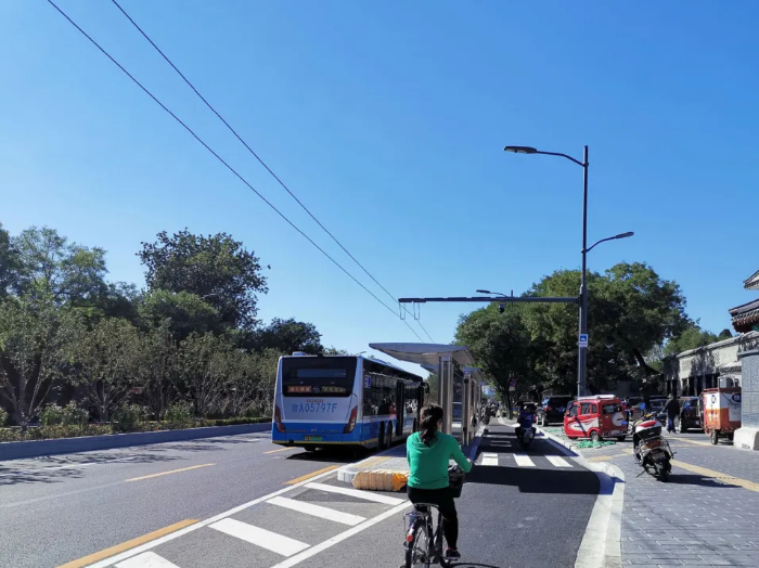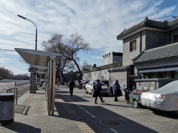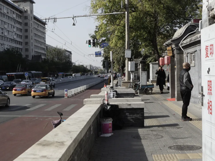 地安門西大街北側(cè),有一段沿街四合院的標(biāo)高比街道高出1米多,這里是平安大街路板最窄的一段。設(shè)計(jì)團(tuán)隊(duì)仔細(xì)地梳理了邊界條件,利用壓縮車道釋放出的有限空間,把人行道調(diào)整至街道標(biāo)高上,讓通行更便捷,臺(tái)上空間整理電箱和燈桿使其更合乎居民的生活需求,整理后的高臺(tái)區(qū)成為傳統(tǒng)四合院與城市道路之間的緩沖帶。