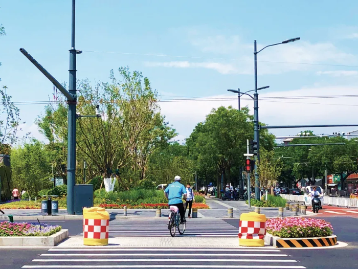 在降速前提下減小機(jī)動(dòng)車道的路幅,增加中央綠化帶;改善兩側(cè)步行道和非機(jī)動(dòng)車道的空間尺度和連續(xù)性;移除或調(diào)整影響步行通行的配電設(shè)施;結(jié)合中央綠化帶增設(shè)過街安全島;優(yōu)化公交港灣,取消非機(jī)動(dòng)車上的占道停車;優(yōu)化十字路口,縮小、統(tǒng)一轉(zhuǎn)彎半徑,減小渠化段車道,增加街角人行空間等。